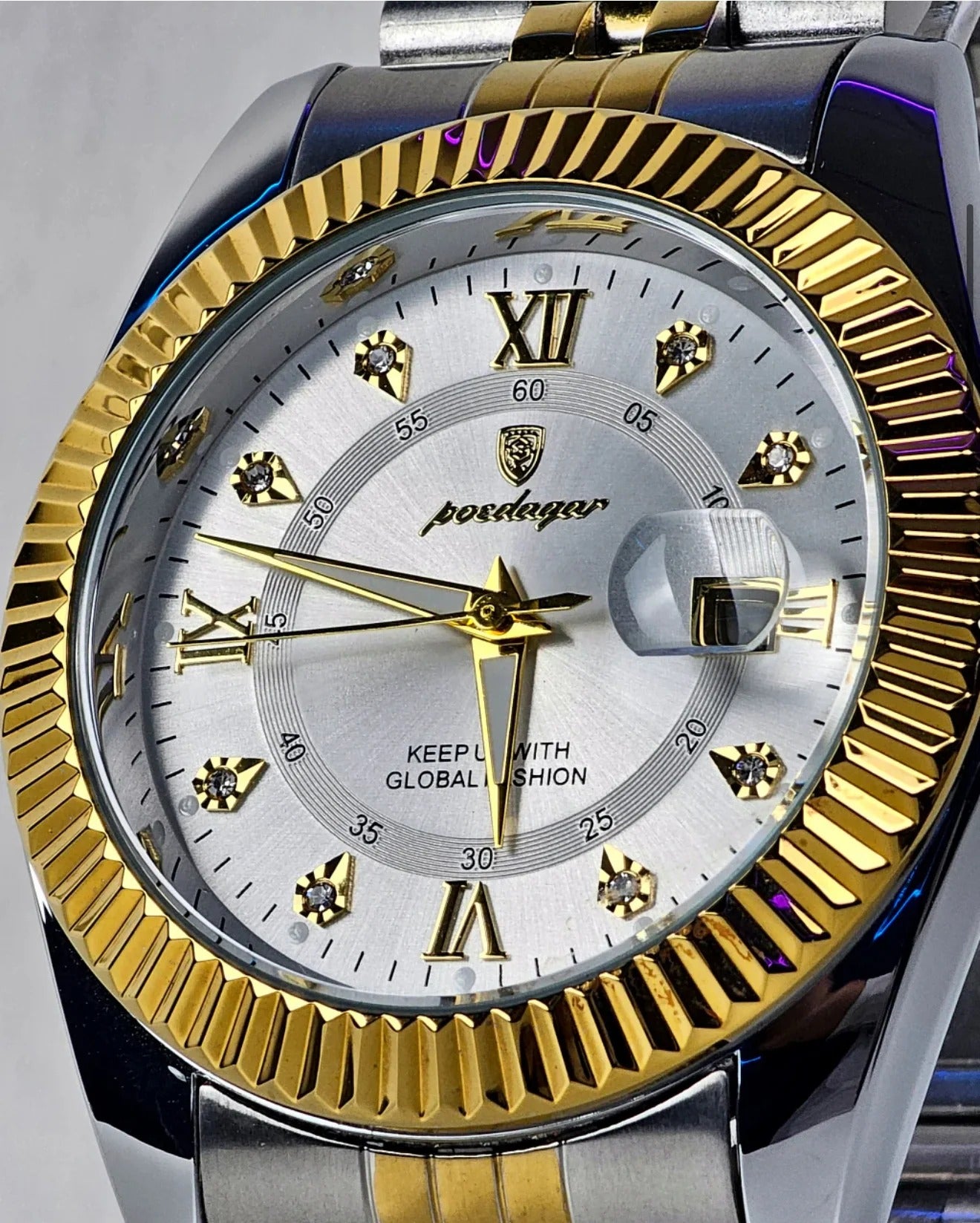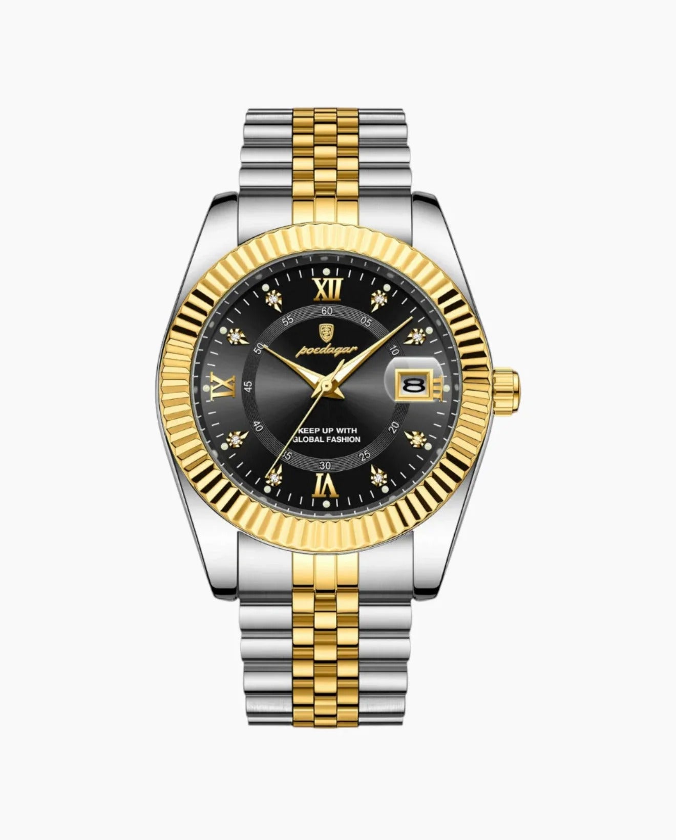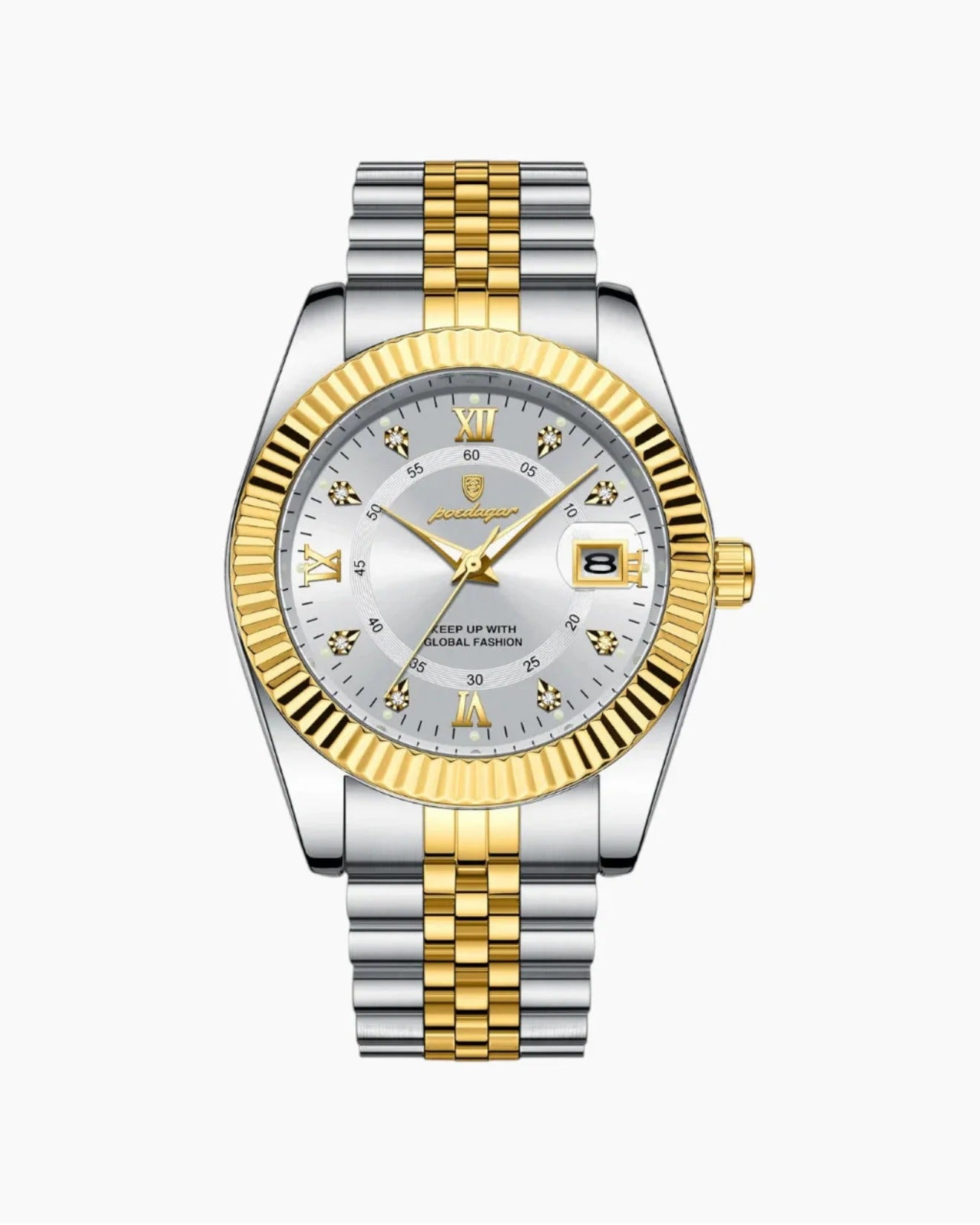 SENTINAL combines polished silver steel with bold gold accents, delivering a striking balance of power and elegance. Its Roman numerals and diamond-cut markers elevate the dial with timeless sophistication.